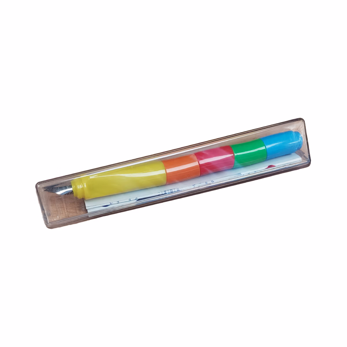 این قلم دارای 5 قطعه جدا شونده رنگی می باشد که مانند لگو بهم متصل می شوند.