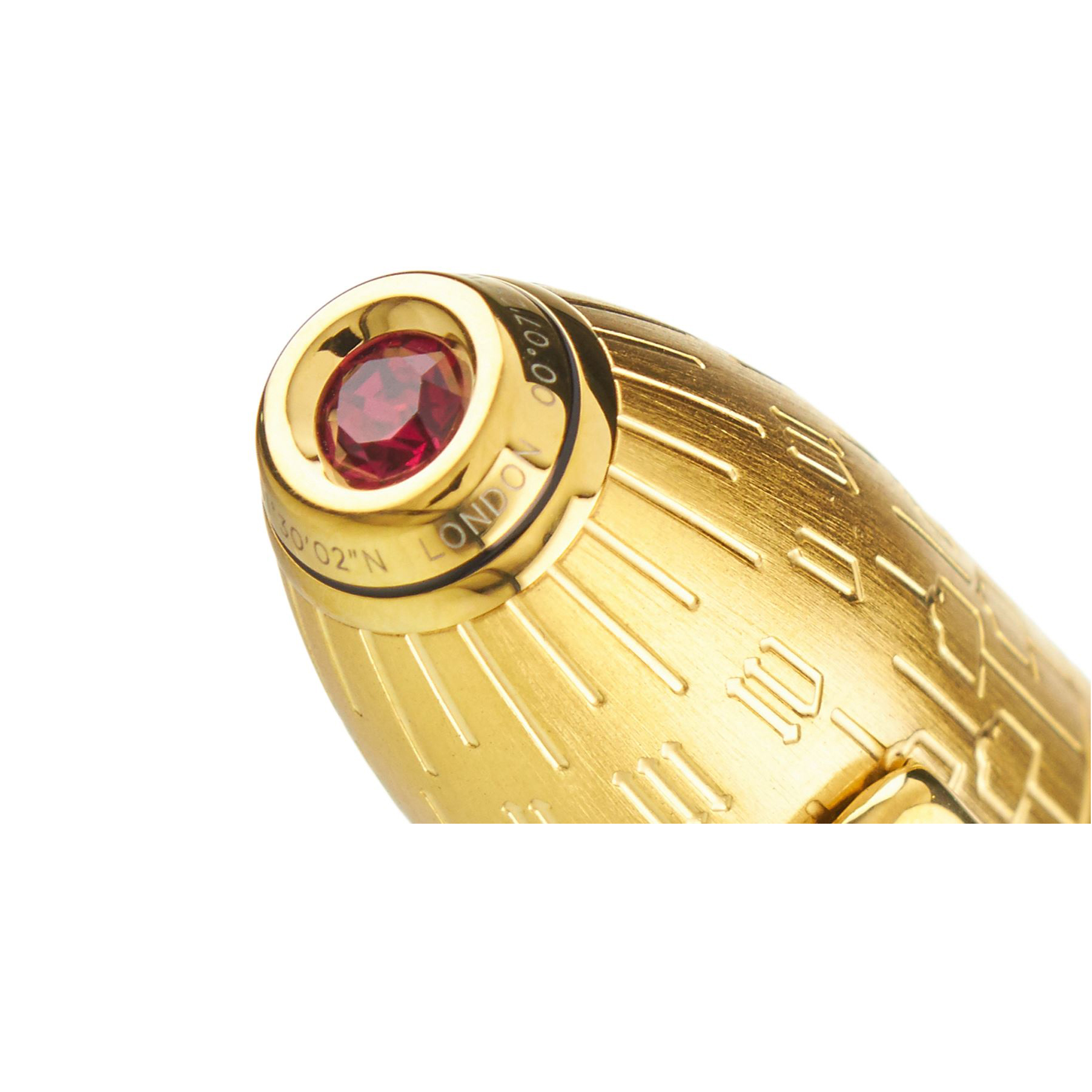 همچنین از کریستال روبی 501 سواروسکی قرمز رنگ با برش درخشان در مقطع بالایی درب خودنویس کراس Peerless London