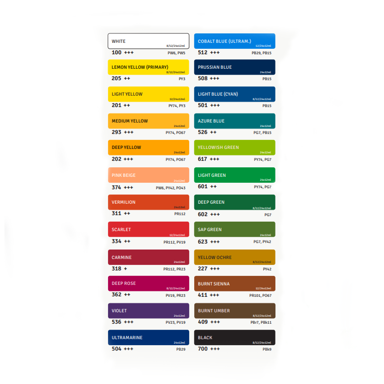 کد 623 سبز Sap Green – کد 227 زرد اوکر Yellow Ochre – کد 411 قهوه ای مایل به قرمز Burnt Sienna  – کد 409 قهوه ای سوخته Burnt Umber  _ کد 700 مشکی  Black )
