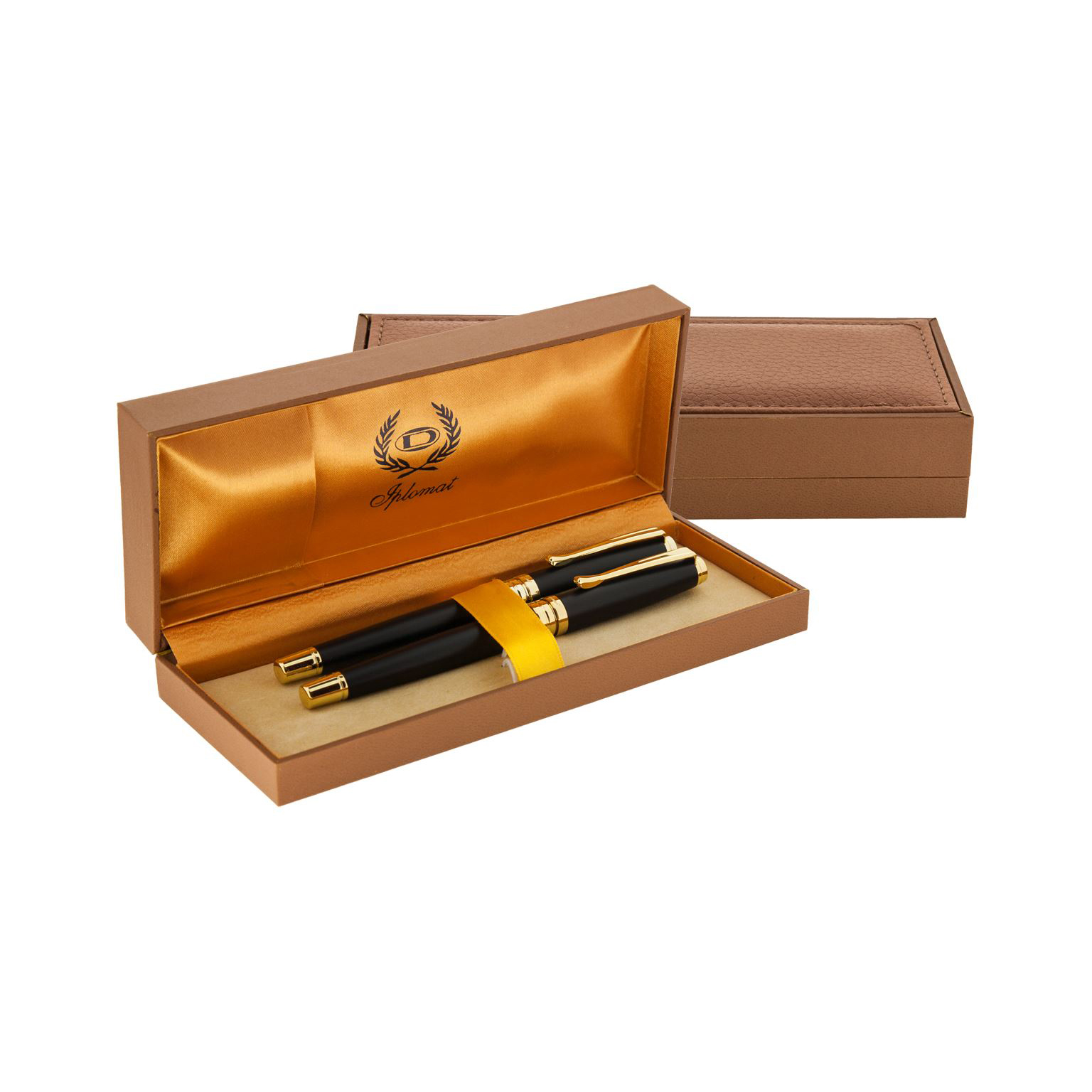 روان نویس و خودنویس آرنا در جعبه نفیس برند ایپلومات در رنگ قهوه ای چرمی قرار گرفته است