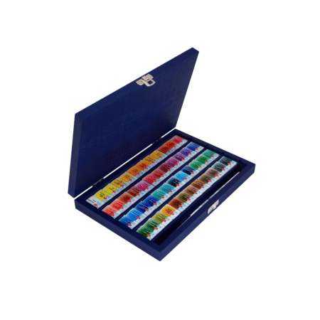 ست آبرنگ دارای در جعبه چوبی و 48 مکعب آبرنگ که در جعبه جای گرفته است.